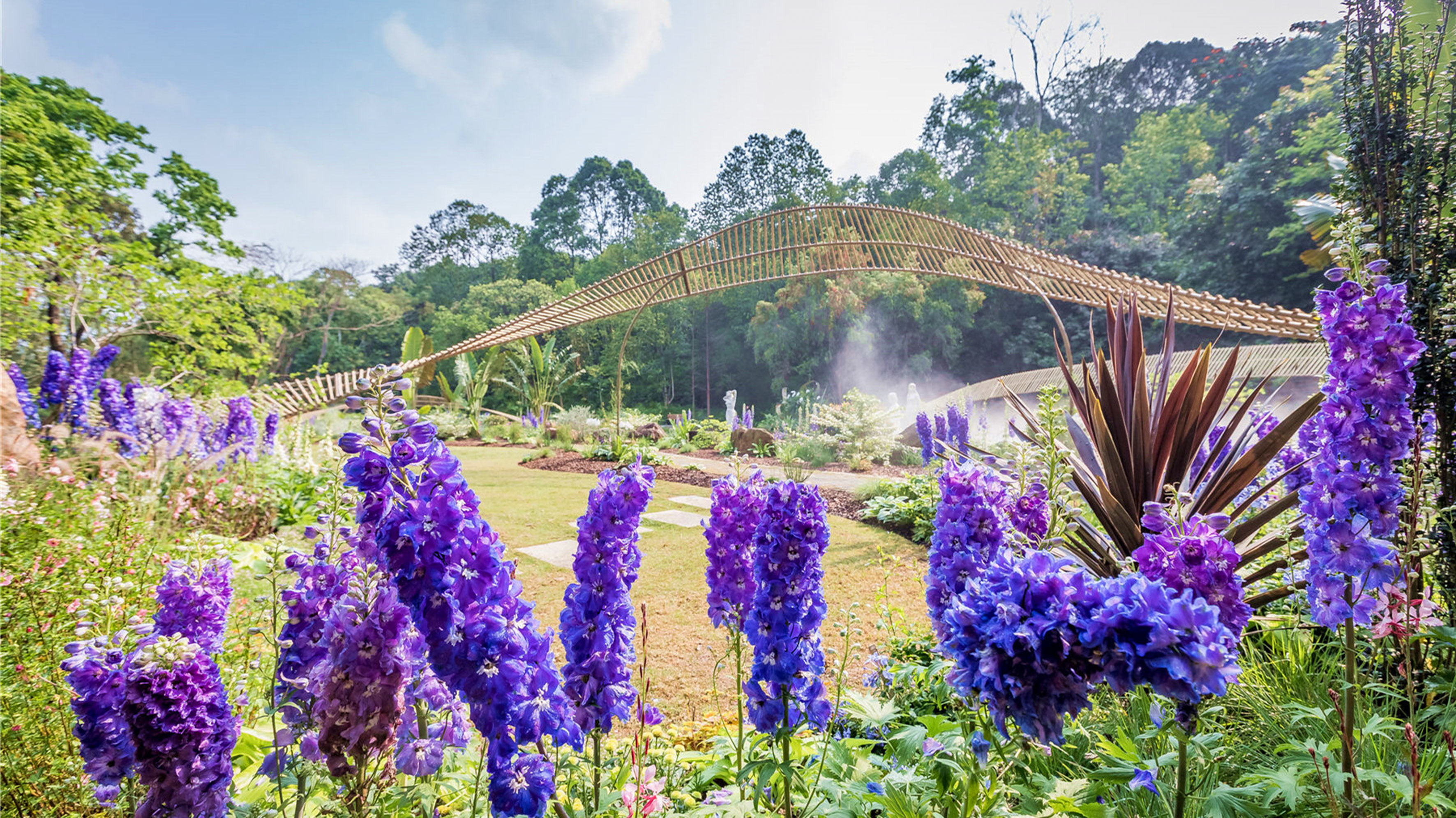 本园以体现呵护自然含义的公园管理中心标志为灵感之源,将其韵律形态演化成舞动优美的竹艺构筑,巧妙地融入了周边环境并贯穿全园,寓意人和自然和谐共生。选用紫罗兰为主题花卉,搭配飞燕草、蓝雪花、绣球花、香茶菜、柳叶马鞭草、吊钟柳、玉簪、朱顶红等新优品种,点缀蝶花荚蒾、嘉氏羊蹄甲等乔灌木,打造层次丰富、清新雅致的特色花境景观。